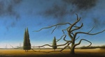 2010drie bomen staan centraal in een landschap waarin het licht een mystieke sfeer heeft.